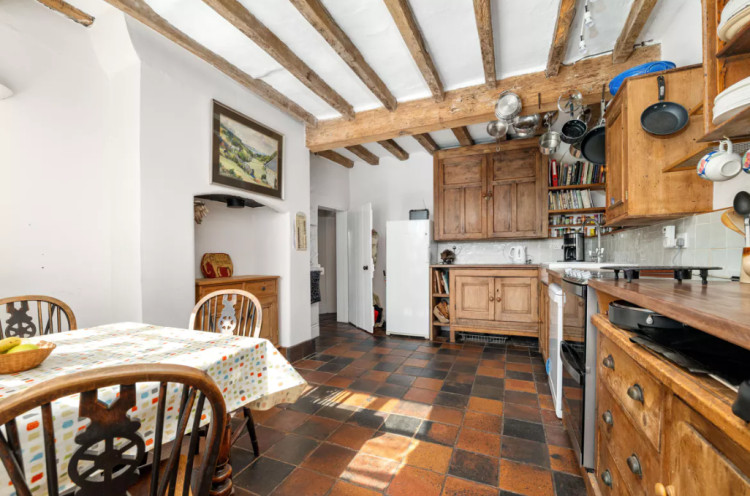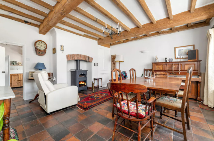 The front door opens into a bright dining hall with a quarry tiled floor, exposed beams and a wood burner inset.